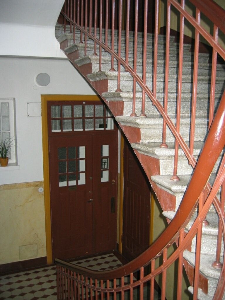 | Porrashuoneeseen johtavassa käytävässä noustaan muutama porras ensimmäiselle asuntotasanteelle. Seinien väritys kuten porrashuoneessa. Lattiamateriaalina kuvioitu keraaminen laatta (tumman punainen + valkoinen), porrasaskelmat harmaata mosaiikkibetonia. |