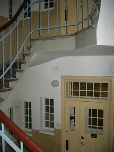 | Käynti sisäpihalta, mutta pääportaan luonteinen. Tyylikäs jugend-henkinen kokonaisuus. Valoaukon ympärille kauniisti kiertyvä porras koostuu kahdesta kiertyvästä syöksystä ja kahdesta välitasanteesta (valoaukon koko n.1400x1550). Tasanteilla vain yksi asunto. Porrashuone on avara valoisa porrashalli. Kattopinta monimuotoinen. |