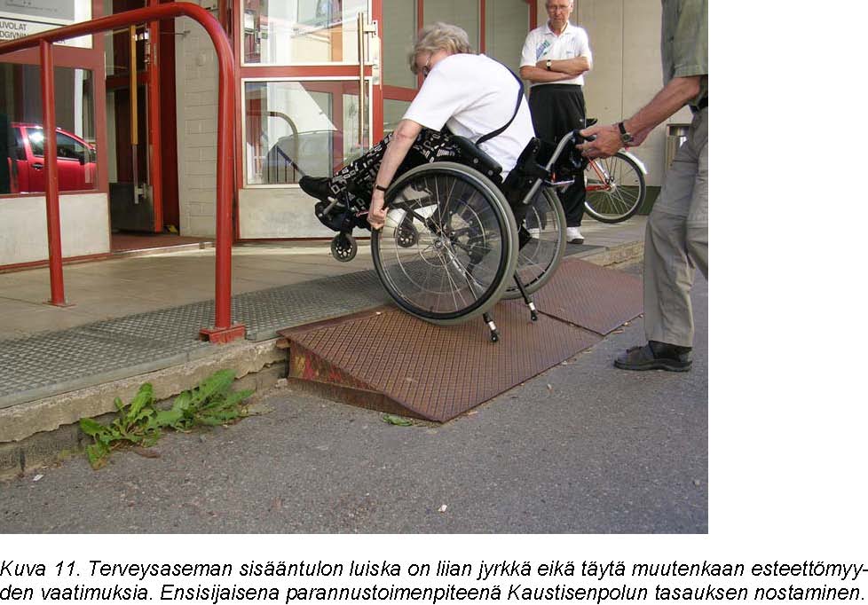 Terveysaseman sisäänkäyntialue on korkean porrasaskelman verran ylempänä Kaustisenpolun kulkuväylää. Korkeuseroa on yritetty hoitaa liian jyrkällä luiskalla, jota omatoiminen pyörätuolinkäyttäjä ei pysty turvallisesti käyttämään. Kaustisenpolun betonilaatoilla pinnoitetun puoliskon laatat ovat hajonneet ja pinta on epätasainen. Asfaltin ja laatoitetun osan rajassa on syväreunainen kouru, joka aiheuttaa kompastumisvaaran. Myös Kaustisenpolun eteläosan jalkakäytävän betonilaatoitus on kulunut ja laatat ovat rikkoutuneet.