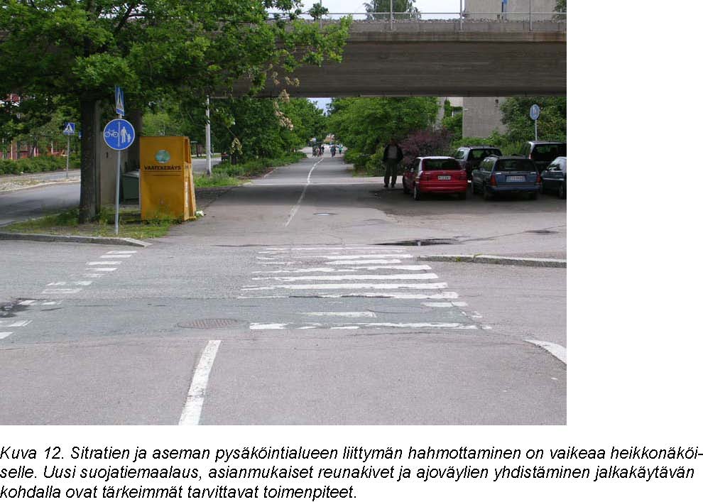 Soittajantieltä ajo Sitratielle ja aseman pysäköintialueelle muodostavat sekavan ja leveän liittymän. Kun vielä suojatien maalaus on kulunut, on heikkonäköisen vaikea hahmottaa ajoalueen ja jalkakäytävän reunaa.
