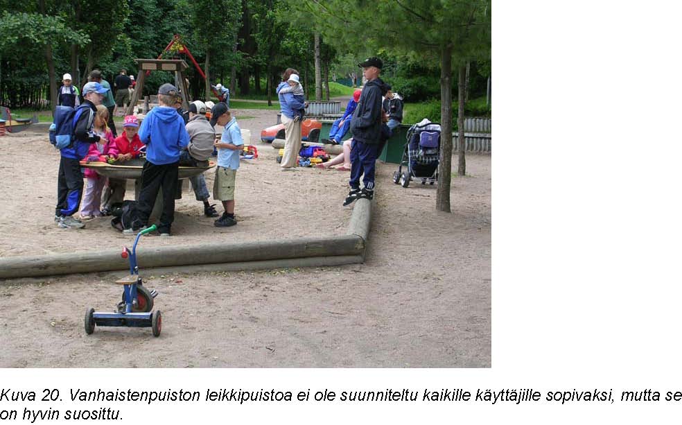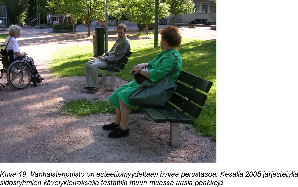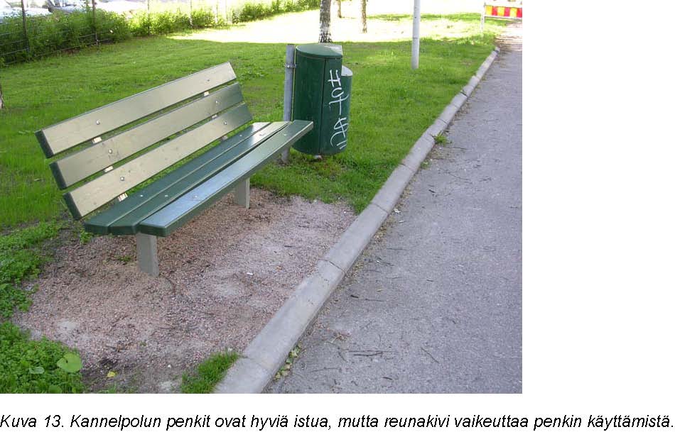 Reitti asemalta Vanhaistenpuistoon kulkee Kannelpolkua alas. Pitkän Kannelpolun nousun varrelle rakennetut levähdyspaikat ovat periaatteessa hyviä, mutta niitä pitäisi parantaa, jotta ne sopisivat kaikille. Itse penkki todettiin sidosryhmien kävelykierroksella hyväksi istua, mutta käsinojat helpottaisivat penkiltä nousemista ja sille istuutumista. Reunakiven jatkuminen penkin kohdalla tekee penkin kohdan tunnistamisen vaikeaksi heikkonäköiselle. Se myös hankaloittaa rollaattorin tai pyörätuolin käyttäjän siirtymistä penkille istumaan.