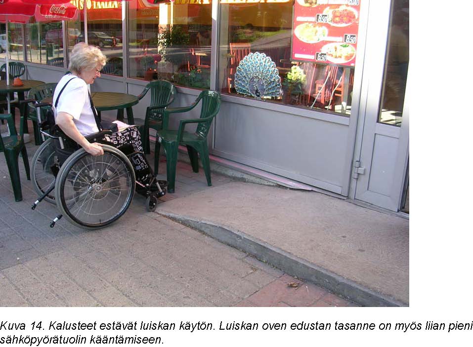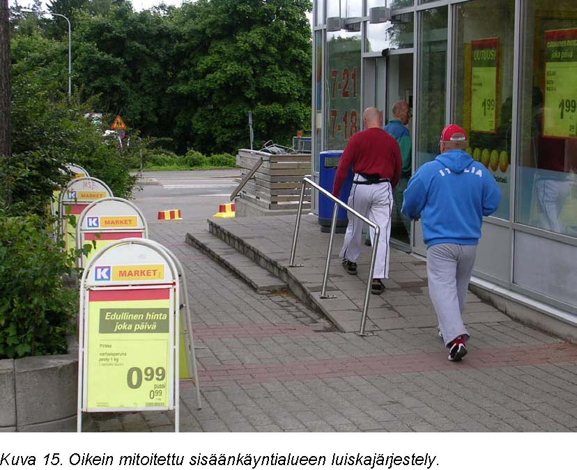 Vanhaistenpuiston kautta on miellyttävä reitti vanhalle ostoskeskukselle. Katualueella sijaitseva, ostoskeskukselta Vanhaistentielle laskeva porras on osin rikkoutunut eikä siinä ole kunnollisia käsijohteita. Ostoskeskuksen keskeiset esteettömyyden ongelmat ovat kuitenkin kiinteistön alueella. Useiden liikkeiden sisäänkäynteihin on rakennettu luiskia, mutta ne ovat lähes kaikissa huonosti toimivia ja mitoitettuja. Ongelmina ovat luiskan ja kynnyksen yhdistelmät, liian pienet kääntötasanteet ovien edessä, käsijohteiden puuttuminen ja luiskan käyttöä hankaloittavat kalusteet. Yksi hyvin toteutettu sisäänkäyntialueen luiska ja porrasjärjestely on uudehkon päivittäistavaramyymälän tontilla.