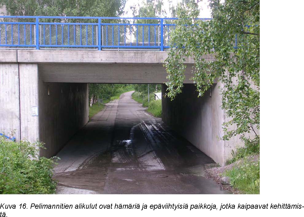 Pelimannitien neljää alikulun viihtyisyyttä ja valoisuutta tulisi parantaa ja Pelimannitien sillan pysäkkialue tulisi päällystää esimerkiksi harmaalla betonikiveyksellä.
