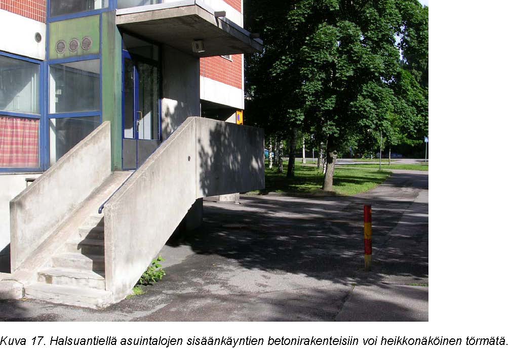 Halsuantien jalkakäytävän reunaan tulisi rakentaa vaalea ja karkea vyöhyke esimerkiksi graniittinoppakivistä varoittamaan sisäänkäynnin tasanteesta, johon voi törmätä.