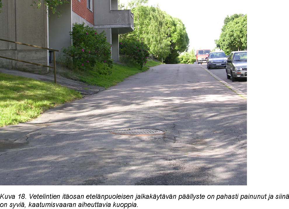Vetelintien itäosan etelänpuoleisen jalkakäytävän päällyste on pahasti painunut ja siinä on syviä, katumisvaaran aiheuttavia kuoppia. Myös Vetelinpolun väylän betonilaatoitus on useasta kohdin rikkoutunut ja painunut. Asukkaat ovat ilmaisseet halunsa säilyttää pinnoite nykyisenlaisena. Halsuantiellä on jalkakäytävän reunassa asuintalojen porrastasanteen betonirakenteita niin, että niihin voi heikkonäköinen törmätä. Kantelettarentietä ollaan vuoden 2005 aikana parantamassa eritasoliittymän ja Pelimannintien kiertoliittymän välisellä osalla.