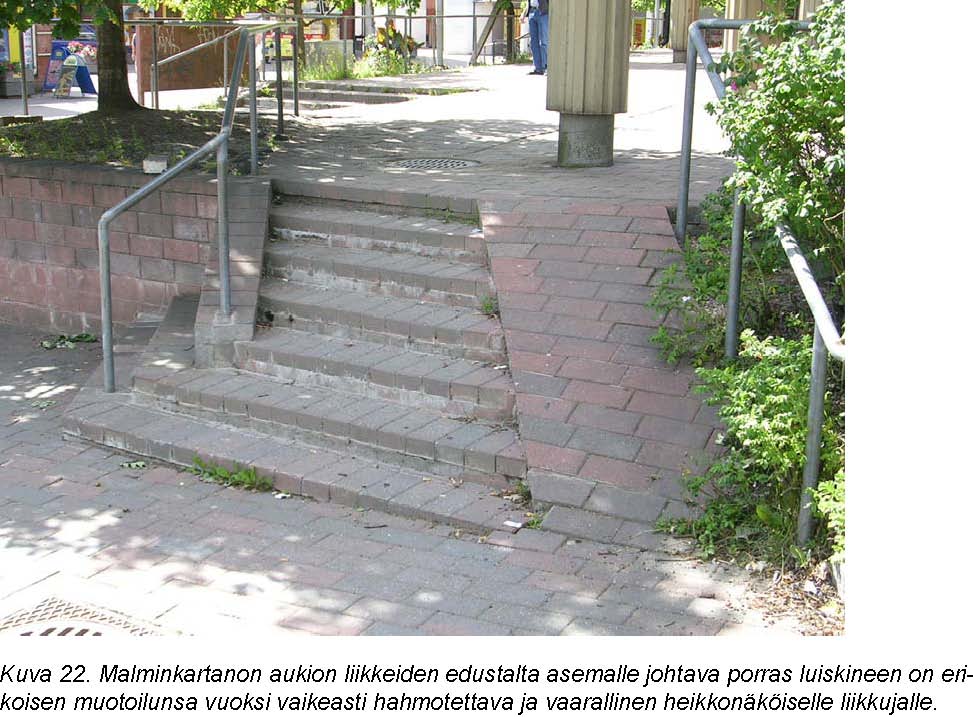 Malminkartanon aukion katualueella sijaitseva kapea porras luiskineen on erikoisen muotonsa ja järjestelynsä vuoksi jopa vaarallinen heikkonäköiselle käyttäjälle. Portaan suunnittelu- ja rakentaminen uudelleen tulisi toteuttaa viimeistään kiinteistön alueen kehittämistoimenpiteiden yhteydessä.