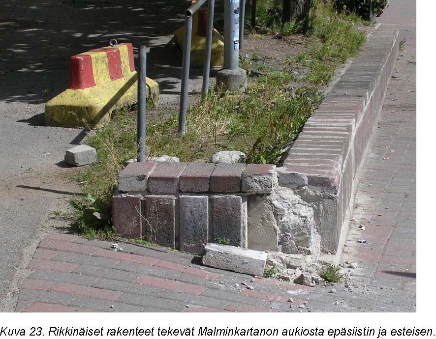 Suojateiden reunakivet, jotka eivät täytä esteettömyyden vaatimuksia, ovat yleinen ongelma kaikilla vanhemmilla alueilla. Reunakivien muuttamiseksi esteettömiksi pitäisikin käynnistää alueellinen hanke. Kiireellisimpinä uudistamiskohteina voidaan pitää suojateitä, joissa on 5 cm tai korkeampia reunakiviä. Esteettömyyden erikoistason alueet ja pääkadut/kokoojakadut tulisi laittaa kuntoon ensimmäisinä. Korjaustarpeen määrittelemiseksi alueen reunakivet tulee kartoittaa.