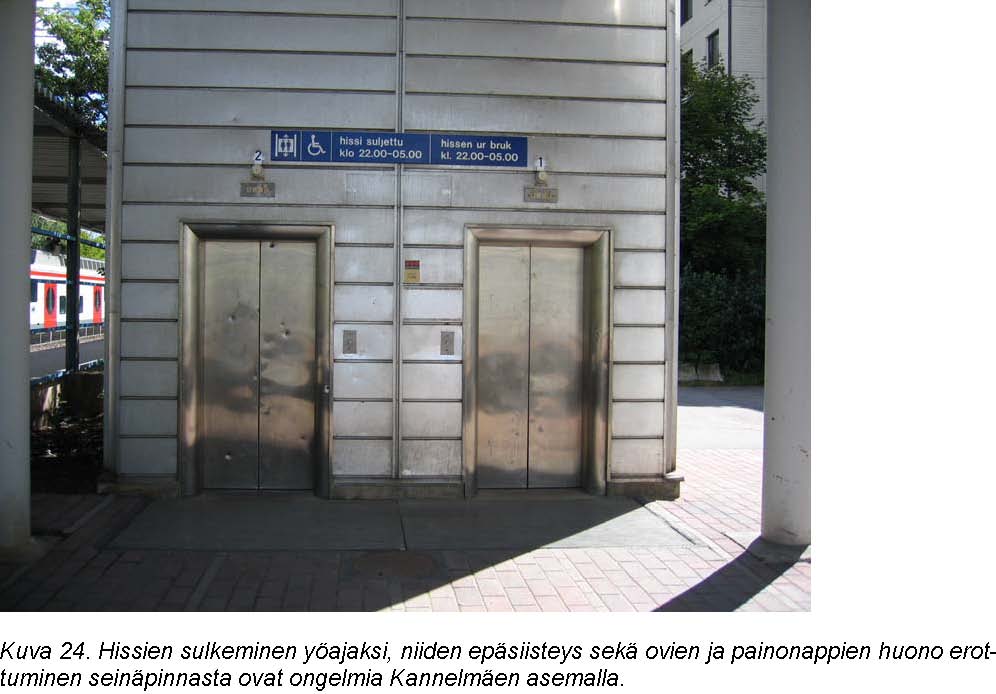 Ylikululle nousevat hissit ovat likaiset ja sotkuiset. Hissien käytön pahin ongelma on, että ne eivät ole toiminnassa 22–05 välisenä aikana. Ylikäytävän länsipuolella (raide 1) oleva luiska on liian jyrkkä ja pitkä. Luiskassa ei ole välitasanteita ja käsijohde katkeaa kannatinpylväisiin.