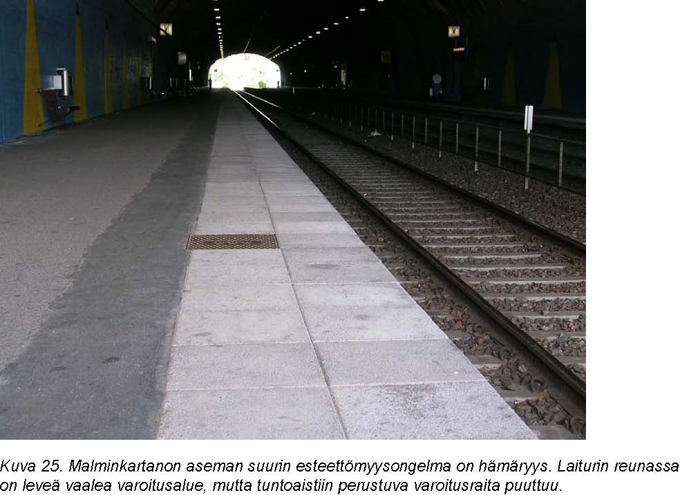 Tunnelissa sijaitseva Malminkartanon aseman laiturialue on yleisilmeeltään pimeä ja turvattomantuntuinen. Asemalaiturit ovat heikosti valaistut. Synkkää yleisilmettä lisää pintamateriaaliksi valittu asfaltti. Suoja-alue on vaaleaa betonia, joka ei kuitenkaan hämärässä erotu riittävästi asfaltista. Tuntoaistiin perustuvaa varoittavaa elementtiä ei ole laiturin reunassa. Pimeässä eivät myöskään laiturialueen kalusteet erotu ja ne pitäisikin merkitä kontrastimateriaali vyöhykkeellä törmäysvaaran välttämiseksi. Lisäksi kaikuminen hankaloittaa äänen varassa toimimista.