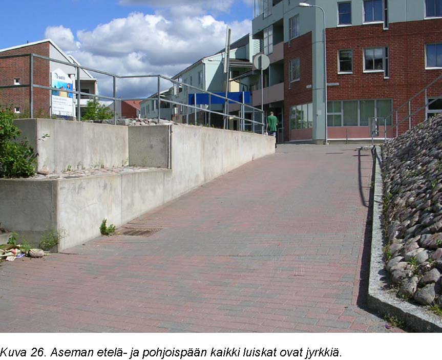 Aseman ylikulkuun nousevan luiskan molemmille puolille tulisi asentaa katkeamaton käsijohde 70 cm:n korkeudelle. Asema kaipaisi kokonaisvaltaista parantamista. Aseman ongelmat on kuvattu yksityiskohtaisemmin kohdassa 2.10 Asemat.
