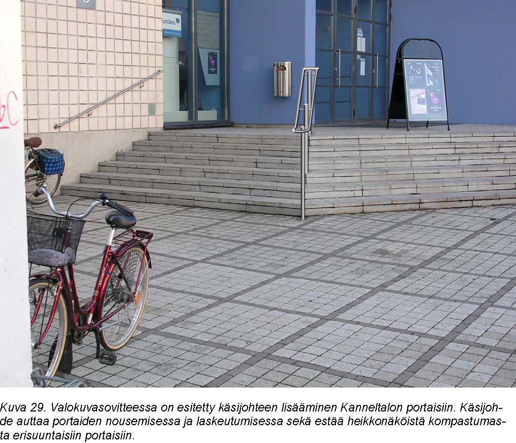Kanneltalon edustan porrasaskelmien reunaan tulisi lisätä musta kontrastiraita havaittavuutta parantamaan. Portaiden suunnanmuutoskohtaan tulisi lisätä asianmukainen käsijohde. Kaide myös estäisi kompastumasta suuntaa muuttavaan portaaseen.