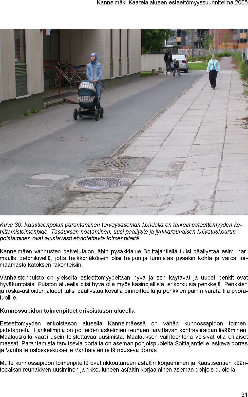Rakennusviraston katu- ja puistoalueille laadittava aluesuunnitelma käsittää Kannelmäki-Kaarela -alueen. Kaarelan alueella on erittäin pieni vanhusväestön osuus muihin alueisiin verrattuna eikä siellä ole myöskään merkittävää määrää palveluja. Malminkartanossa on myös varsin vähän vanhuksia. Näiden perusteiden mukaisesti tarkastelut ja merkittävimmät esteettömyyden kehittämistoimenpiteet rajattiin Kannelmäkeen ja Malminkartanon aseman lähialueeseen.