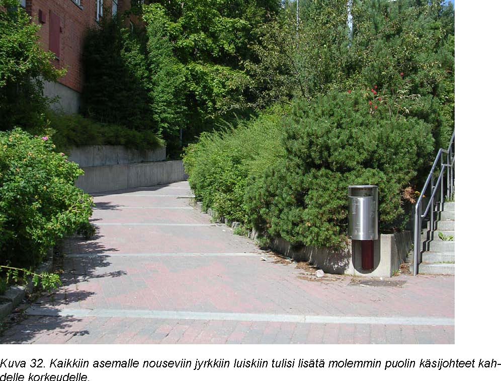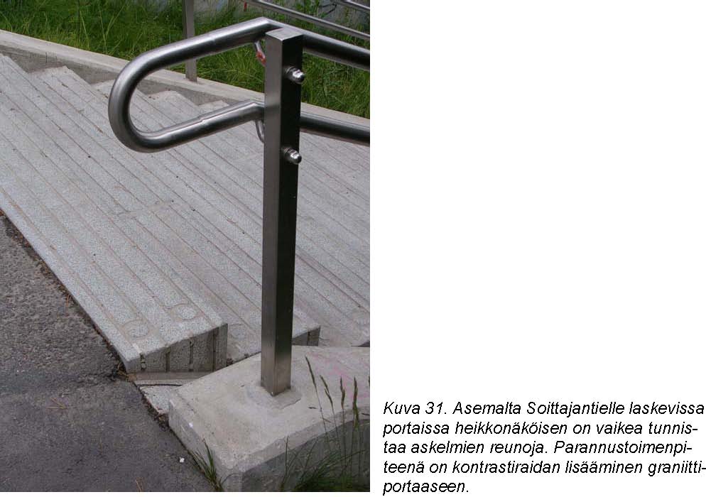Portaissa on kontrasti raita, joka on tehty metallista ja erottuu hyvin. Ongelmana ratkaisussa on reunan liukkaus ja sen viettäminen alaspäin. Raiteelta 2 nousevissa portaissa vaunuluiska vaihtaa puolta välitasanteella. Kaikissa portaissa vaunuluiskat tulisi erottaa käsijohteella, merkitä alkamiskohta ja ohjata ihmiset käyttämään turvallista reunaa. Portaiden käsijohteet ovat samanväriset kuin ikkunaprofiili, joten niitä on vaikea hahmottaa. Lepotasanteen kohdalla käsijohteeseen on kiinnitetty roska-astia.