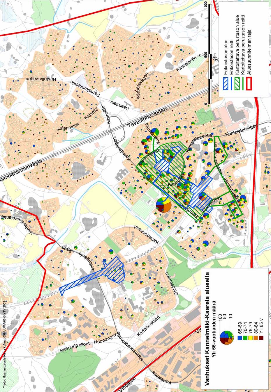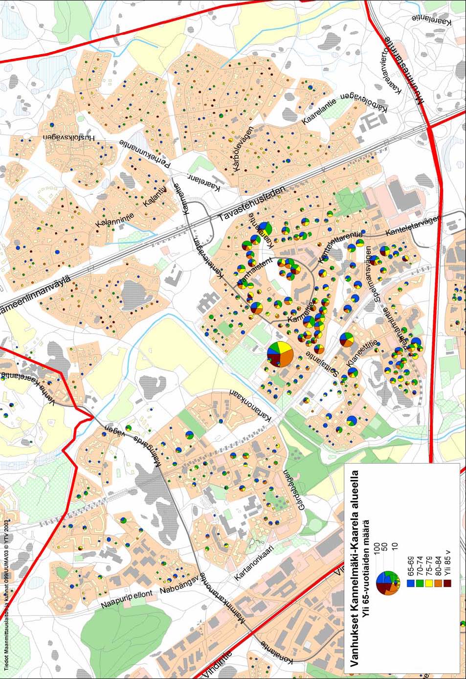 Vanhusten sijoittuminen koko suunnittelualueella tarkasteltiin käyttämällä tietokantana SeutuCD:n tietoja vuoden 2002 lopulta. Vaikka tieto onkin pari vuotta vanhaa, riittää sen tarkkuus tämän suunnitelman tarkasteluihin. Merkittävänä iäkkäiden ihmisten asuinpaikkana erottuu Kannelmäen vanhusten palvelutalo, jossa on 115 paikkaa. Myös Rumpupolun vanhusten palvelutalossa ja koko radan koillispuolisella alueella Soittajantien kaakkoispuolella asuu paljon vanhuksia. Vanhaistentie 15:ssa sijaitsevan Kannelkodin vanhainkodin tietoja ei ollut tietokannassa. Kannelkodissa on paljon huolenpitoa tarvitsevia vanhuksia, jotka liikkuvat kiinteistön alueen ulkopuolella hyvin vähän.
