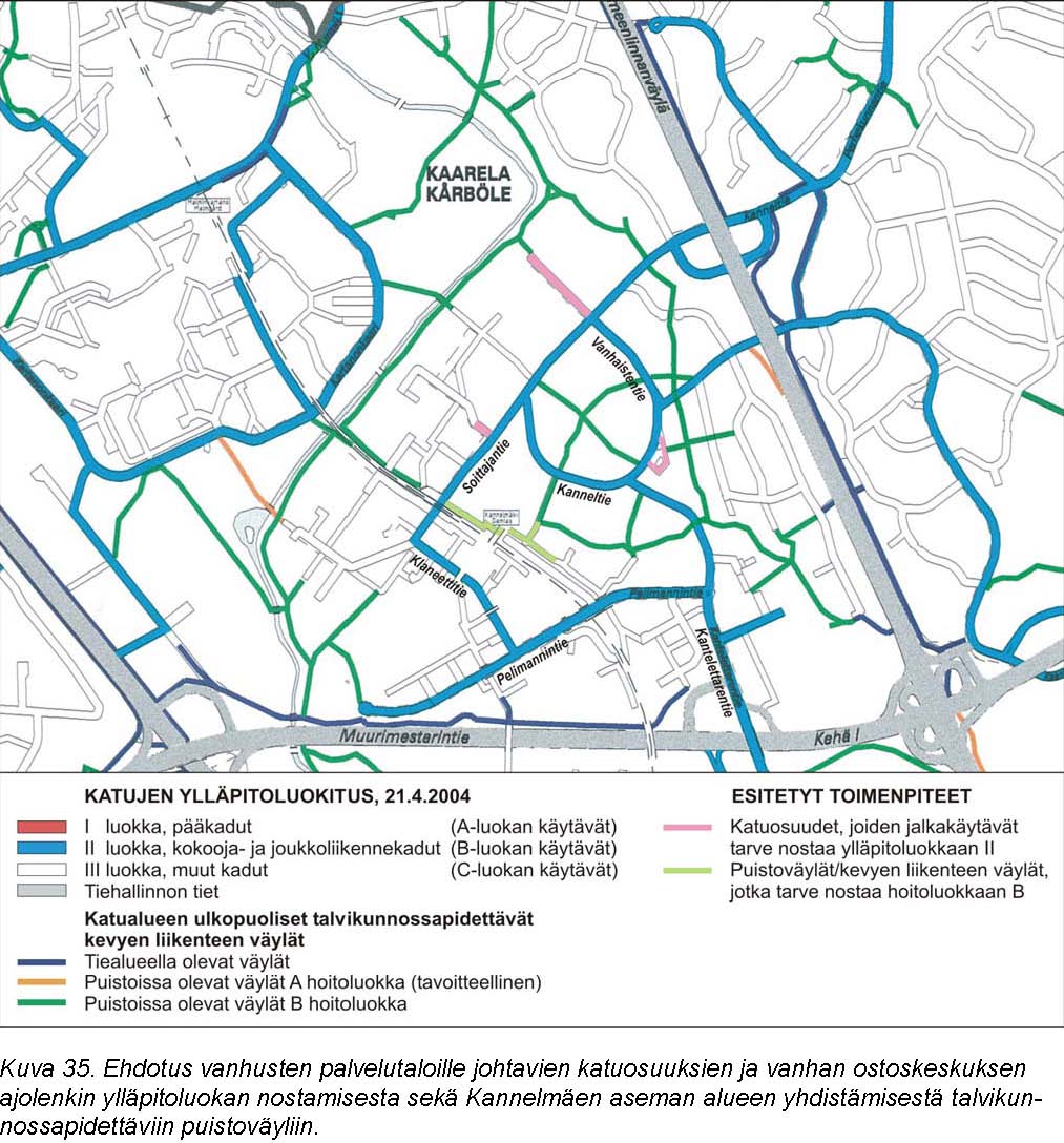 Nämä kadut kattavat tärkeimmät yhteydet asemille ja päivittäispalveluihin. Nykyisten II luokan katujen ulkopuolelle jää kuitenkin muutama katuosuus, joilla tarvitaan korkeaa esteettömyyttä ja talvihoidon laatutasoa. Tällaisia ovat Urkupillintie Soittajantieltä Kannelmäen vanhusten palvelutalolle, Vanhaistentie Soittajantieltä Kannelkodin vanhainkotiin ja ajolenkki vanhan ostoskeskuksen edustalla. Malminkartanossa ei ole vastaavanlaisia tarpeita.