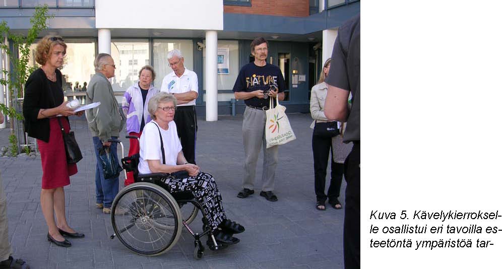 Kävelykierrokselle osallistui noin 10 henkeä. Ryhmä koostui suhteellisen iäkkäistä alueen asukkaista, vammaisjärjestöjen edustajista, alueen suunnittelijoista rakennusvirastosta ja kaupunkisuunnitteluvirastosta sekä Helsinki kaikille –projektin ja konsultin edustajista.