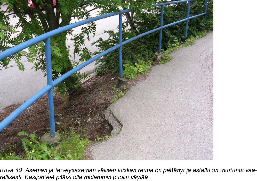 Kaustisentien kääntöpaikalta kohti terveysasemaa nousevan jyrkän kevyenliikenteen väylän sortunut reuna ja murtunut asfaltti tulisi korjata. Molemmille puolille luiskaa tulisi asentaa asianmukaiset käsijohteet.