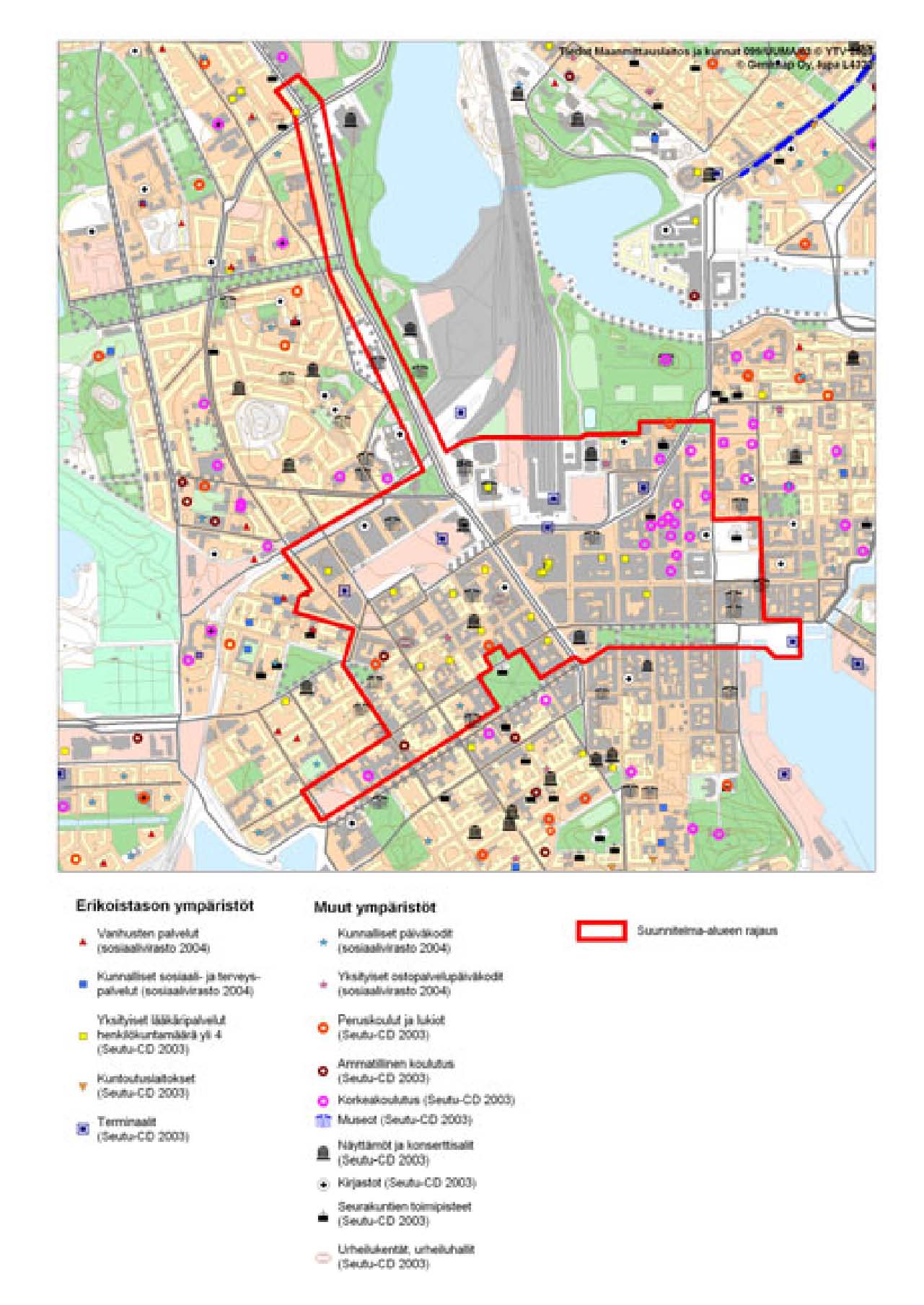 Työn ensimmäisenä vaiheena tarkistettiin esteettömyyden erikoistasoa vaativien toimipaikkojen sijoittuminen. Lähtökohtana oli Helsingin kaupungin esteettömyyssuunnitelman ajalle 2005-2010 yhteydessä laadittu tietokanta esteettömyyden kannalta tärkeistä toimipaikoista. Erityisen tärkeitä, erikoistason esteettömyyttä ympäristöltään vaativia toimipaikkoja ovat vanhusten palvelut, sosiaali- ja terveyspalvelut, kuntoutuslaitokset ja rautatieasemat. Lisäksi tarkasteltiin muiden esteettömyyden näkökulmasta tärkeiden palveluiden sijoittumista alueelle. Tällaisia ovat päiväkodit, koulut ja oppilaitokset, kirjastot, museot, kokoontumistilat ja seurakuntien toimipaikat.