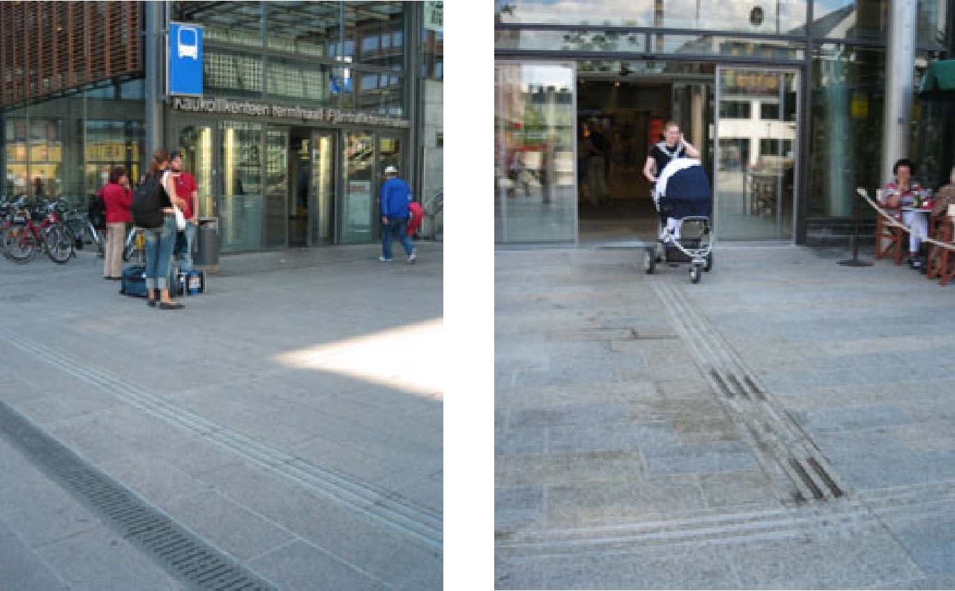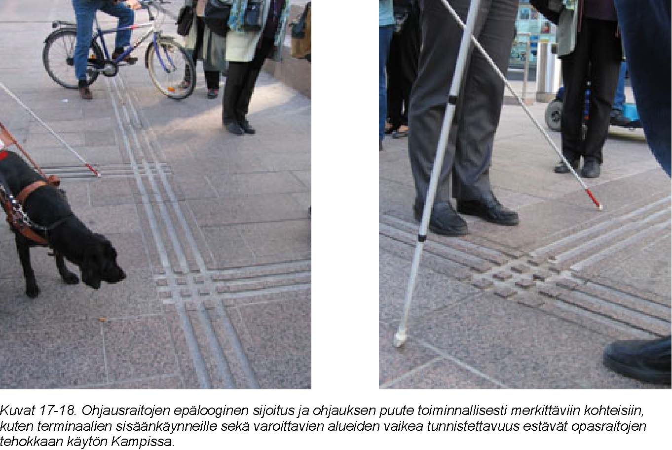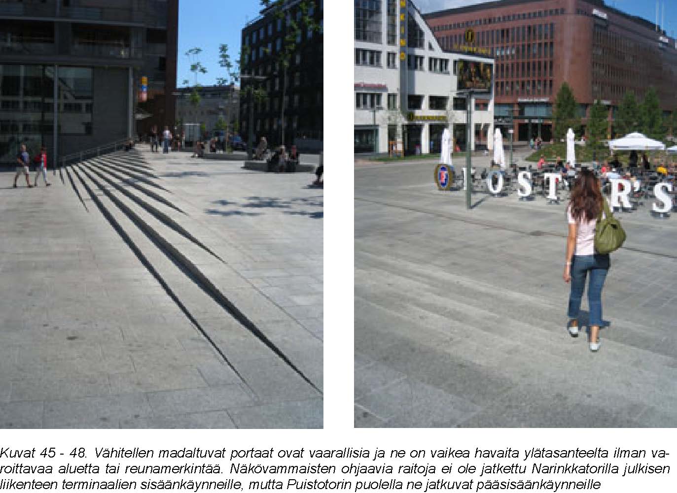Toimenpiteet: -Liukuportaisiin ääni- ja väritunnisteet osoittamaan kulkusuuntaa -Portaaseen kontrastiraidat PORRAS ja LUISKA asematunnelin keskitasolle -Luiskan pituuskaltevuus 26,5 % -Portaassa ja luiskassa ei käsijohdetta Toimenpiteet: -Luiskaan ja portaaseen käsijohteet molemmille puolille LIUKUPORRAS keskitasolta alatasolle -Liukuportaassa on liikennevalot osoittamassa kulkusuunnan -Liukuportaan edessä on kontrastimateriaalivyöhyke AIKATAULU metrolle vievien liukuportaiden yläpäässä -Liian korkealla -Tekstiä vaikea hahmottaa LAITURIALUE RAUTATIEN METROASEMALLA -Laiturin reunassa odotusalueen erottavassa raidassa ei tuntokontrastia -Kumireunus laiturin reunassa hyvä -Kalustevyöhykettä ei merkitty kulkupintaan -Penkkien istuinkorkeus 440 mm, liian matala -Roska-astian aukon korkeus 1020 mm