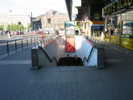 -Valo-opasteessa värit väärin päin, tumma teksti ei erotu valo-pohjasta METRON SISÄÄNKÄYNTI Kaisaniemenkadulle