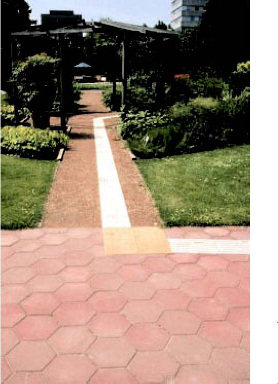 Kuva 4. Opastavia päällystelaattoja on monenlaisia ja käynnissä on parhaillaan useita kehityshankkeita Suomen oloihin sopivien laattojen kehittämiseksi. Tämä kuva on yksi esimerkki opastelaattojen käytöstä puistokäytävällä (Utrecht, Hollanti).