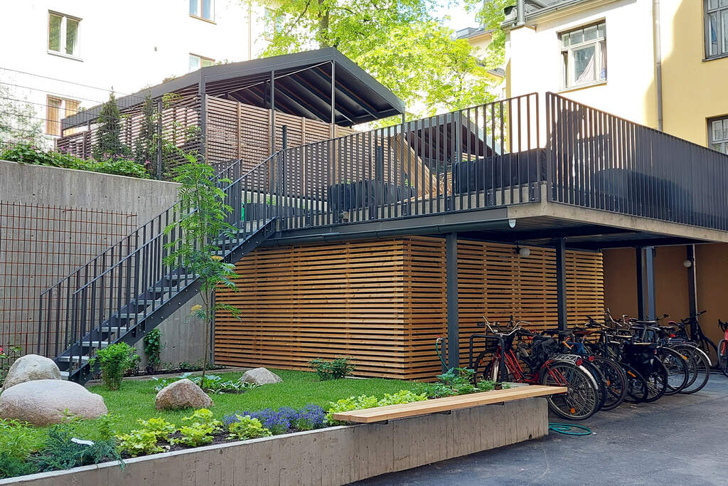 Den grundliga förbättringen av gården vid Asunto Oy Helsinginkatu 23 har en exceptionell lösning, gårdens vistelseplats lyftes upp på taket på det nya avfallsrummet närmare ljuset, nästan på samma nivå som grannbolagets gård. De typiska utrymmesproblemen för höghusgårdarna i Helsingfors stamstad har i detta projekt lösts på ett sätt som har öppnat en helt ny möjlighet för bolagets invånare att utnyttja gården som en fortsättning på bostäderna. I stället för enbart problemlösning har man i projektet framställt direkt mervärde för invånarna. Stödmurarna, växtligheten, användningen av gårdsutrymmet samt avfallsrummets och cykeltakets konstruktioner jämte detaljer har planerats och genomförts av mycket hög kvalitet.