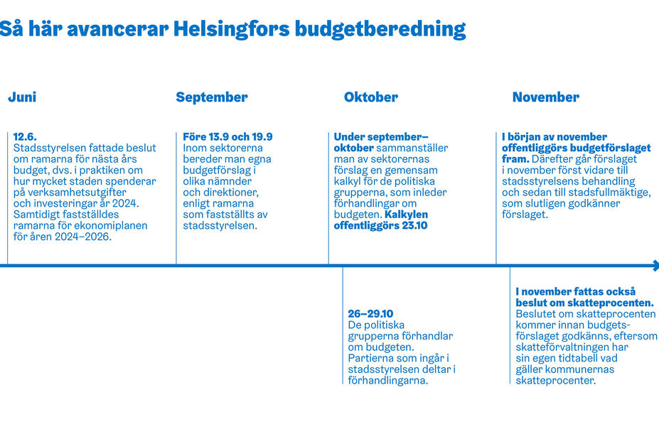 Budgetförhandlingarna mellan de partier som ingår i stadsstyrelsen förs under oktober månad och borgmästarens förslag publiceras efter det. Först går förslaget vidare till behandling i stadsstyrelsen i november, varefter stadsfullmäktige fattar beslutet om budgeten.