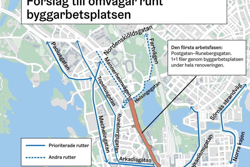 I den första etappen flyttas spårvagnslinjerna 4 och 10 från Mannerheimvägen till Runebergsgatan. Även en del av busslinjerna flyttas från Mannerheimvägen till Runebergsgatan. I den andra etappen, det vill säga från och med hösten 2024 blir det fler ändringar i kollektivtrafikens rutter. HRT berättar närmare om förändringarna i kollektivtrafiken på webbplatsen hsl.fi och i sina andra kanaler. https://www.hsl.fi/(Länk leder till extern tjänst)