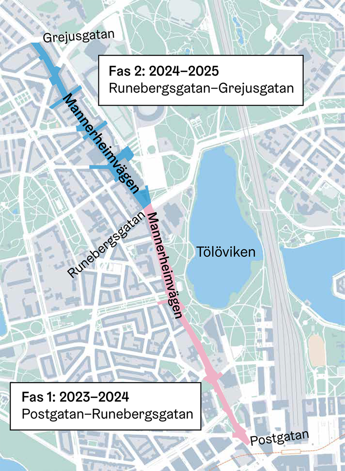 Först renoveras avsnittet mellan Postgatan och Runebergsgatan 2023–2024. I slutet av 2024 flyttar arbetet till mellan Runebergsgatan och Grejusgatan när den första etappen är trafikmässigt klar.